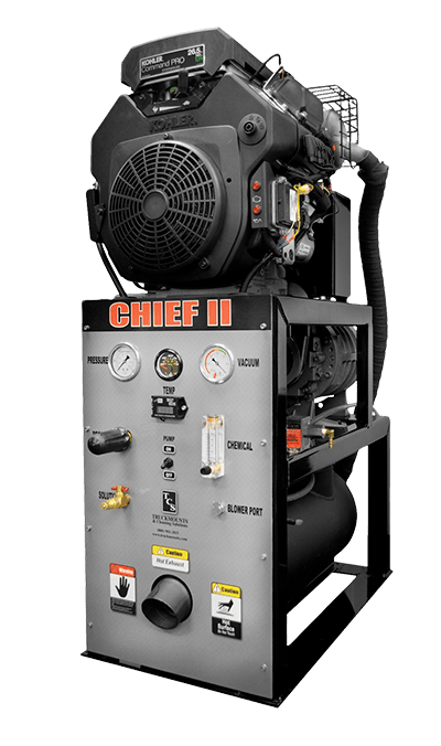 The TCS CHIEF II is only one model up from the standard TCS CHIEF, but it’s a big jump in performance. This is a true dual-wand system, capable of sending hot water out and recovering it from two operators each 250 feet from the vehicle, or a single run of over 500 feet. With the most horsepower and CFM of any TCS truckmount, the CHIEF II is ideal for large commercial cleaning. Designed to be equally effective cleaning carpet and hard surfaces as well as water damage restoration work, this truck-mounted equipment is the top of the TCS line.